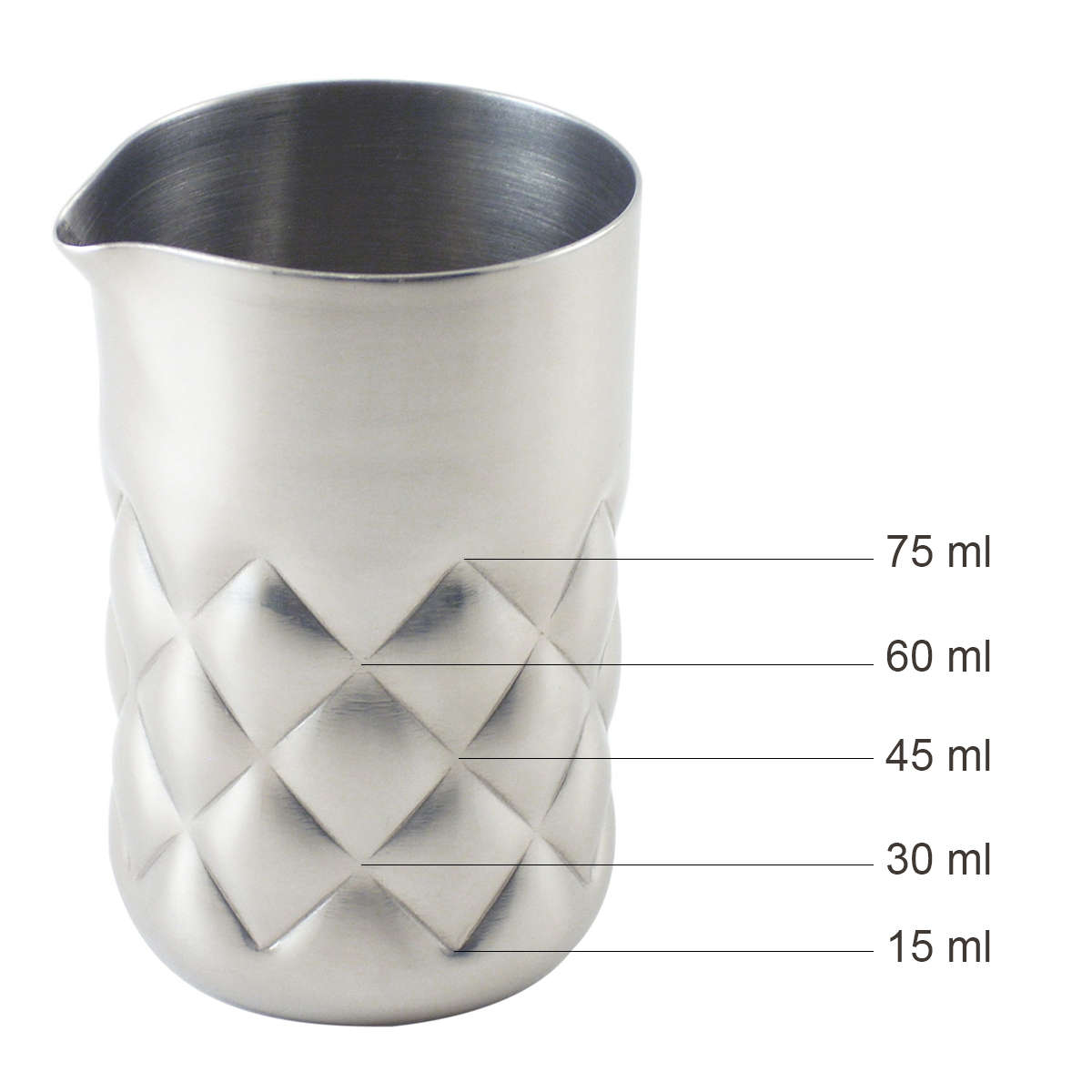 Das Barmaß Iron Jigger sieht wie ein kleines Edelstahl Rührglas aus. Es besitzt eine Ausgusslippe und besitzt ein strukturiertes Karomuster.