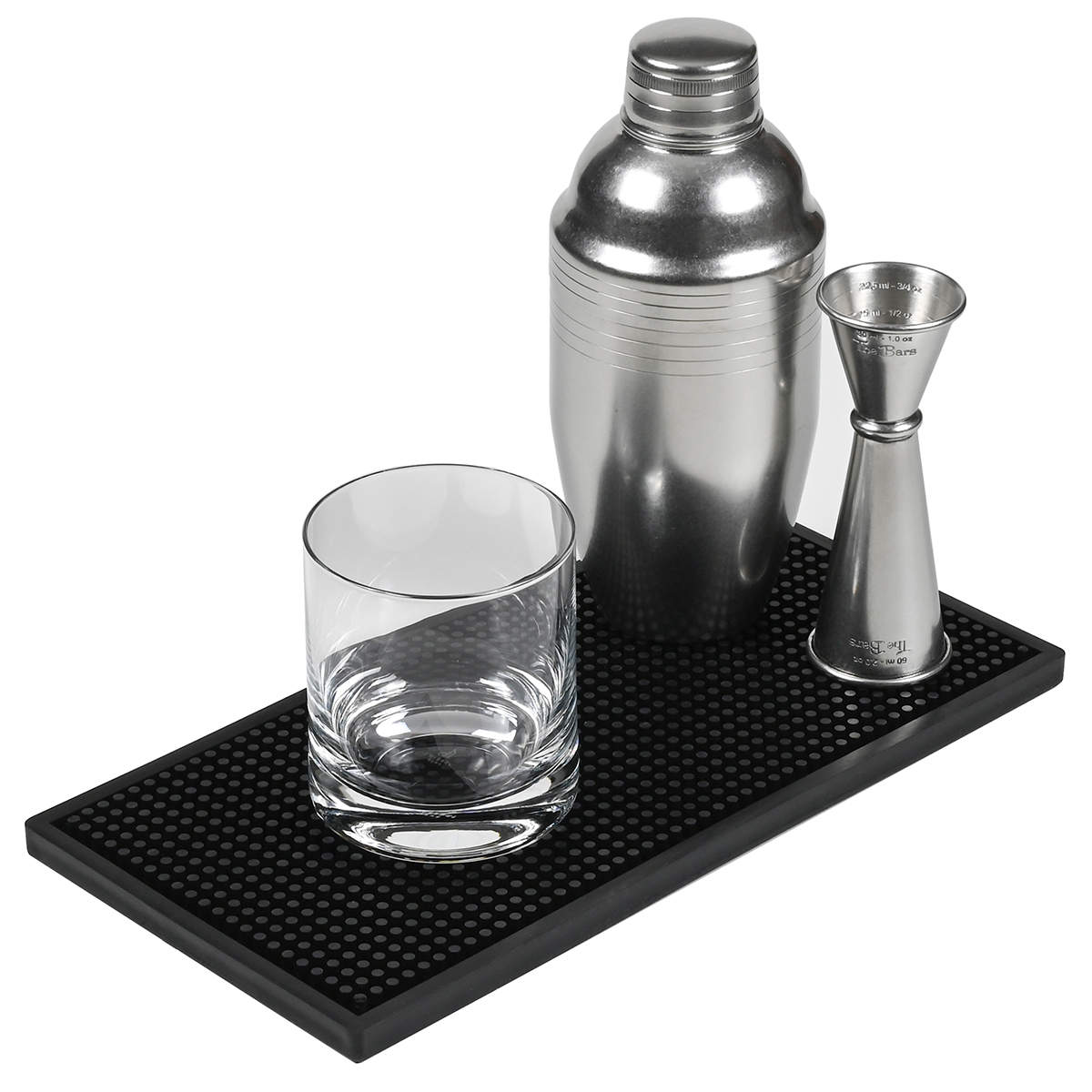 Stellen Gläser, Cocktailshaker und anderes Barzubehör auf der Barmatte ab. Herablaufende Flüssigkeit läuft in die Zwischenräume der Barmatte und wird dort gesammelt. So bleibt ihre Theke sauber und das Wasser sammelt sich nicht am Fuß der Cocktailgläser.