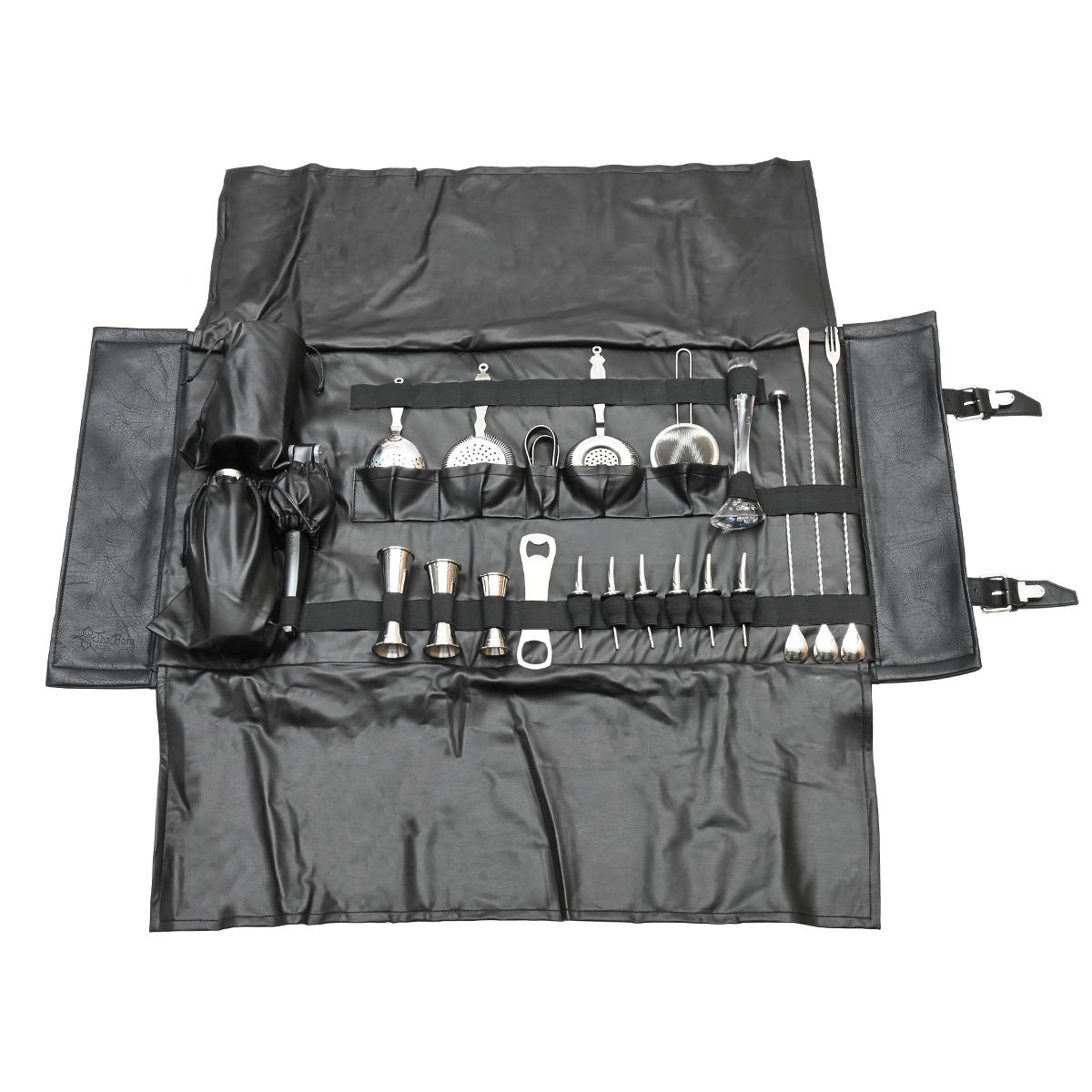 Schöne Barrolle aus schwarzem Kunstleder mit umfangreichen und hochwertigem Cocktailset. Mit diesem Barkeeper Set haben Sie alles griffbereit, was Sie zum Mixen von Cocktails benötigen. Die Barrolle hat einen Griff zum Tragen und zusätzlich eine abnehmbare Umhänge