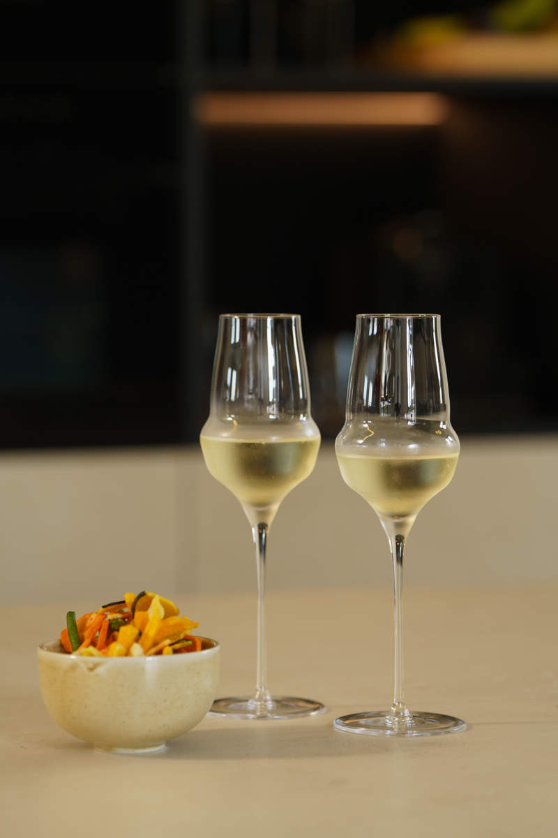 Passend zum Champagnerglas aus der Serie Cocoon sind vier Weingläser und zwei Weinbecher ohne Stiel erhältlich.