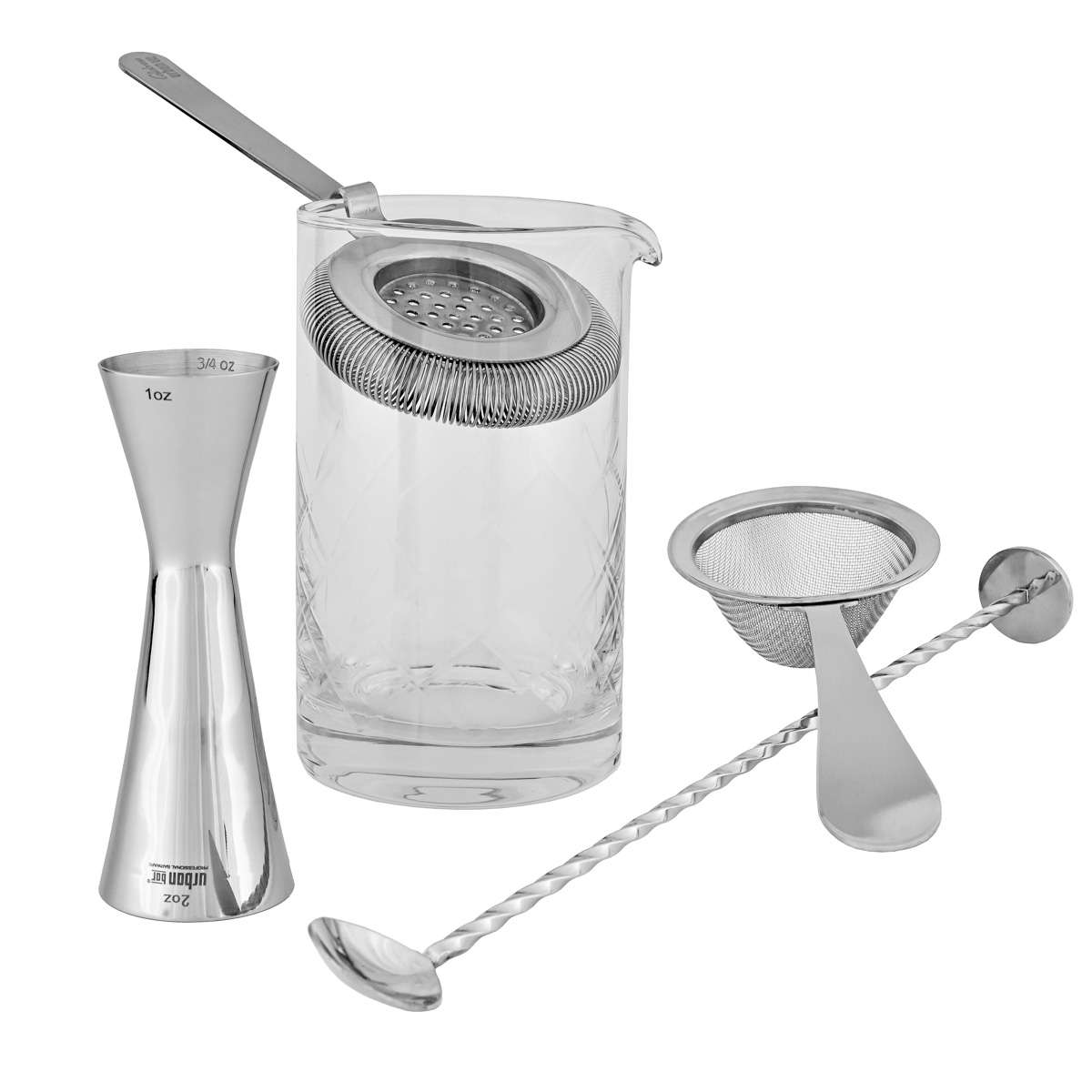 Rührglas mit Rautenmuster Barmaß - Aero Jigger Barlöffel Calabrese Muddler Barsieb Calabrese Hawthorne Feinsieb Biloxi Einzelne Artikel - nicht in Set Karton