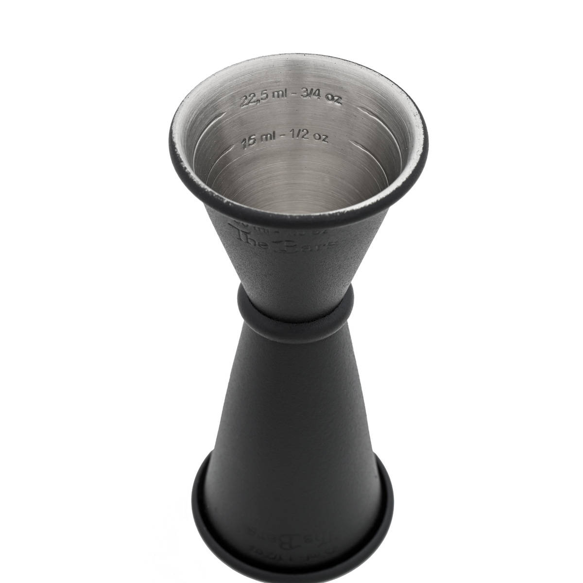 Jigger Japan aus Edelstahl mit matt schwarzer Beschichtung. Das Barmaß hat die für japanische Jigger typische Form mit zwei langgezogen, konischen Messbechern. diese sind mit einem kleinen Ring verbunden.