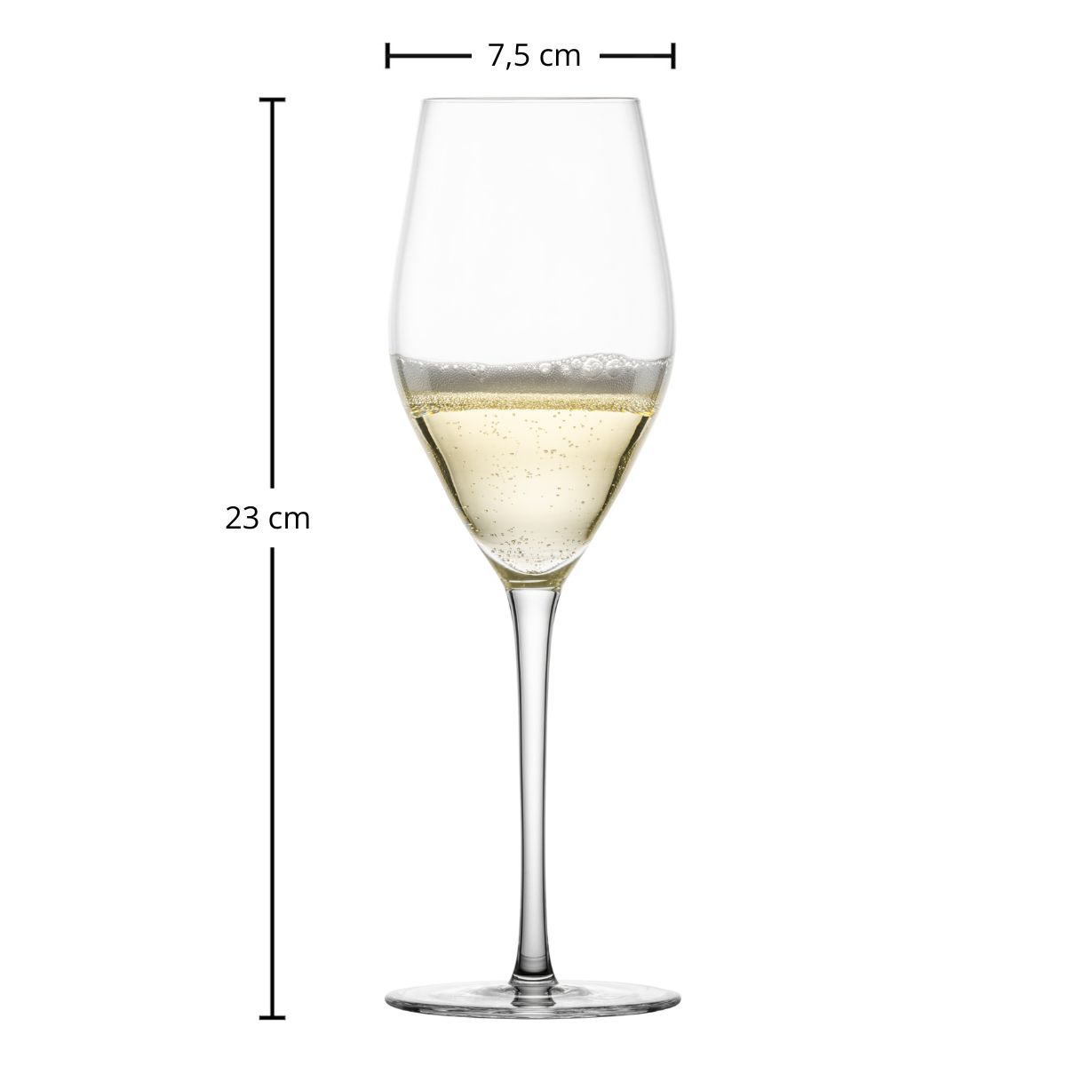 Das elegante Sektglas hat ein Volumen von 302 ml und ist mit einem Moussierpunkt am Boden des Kelches versehen. Diese kleine aufgeraute Stelle sorgt dafür, dass die Kohlensäure sich leichter zu Blasen bindet und im Glas aufsteigt.