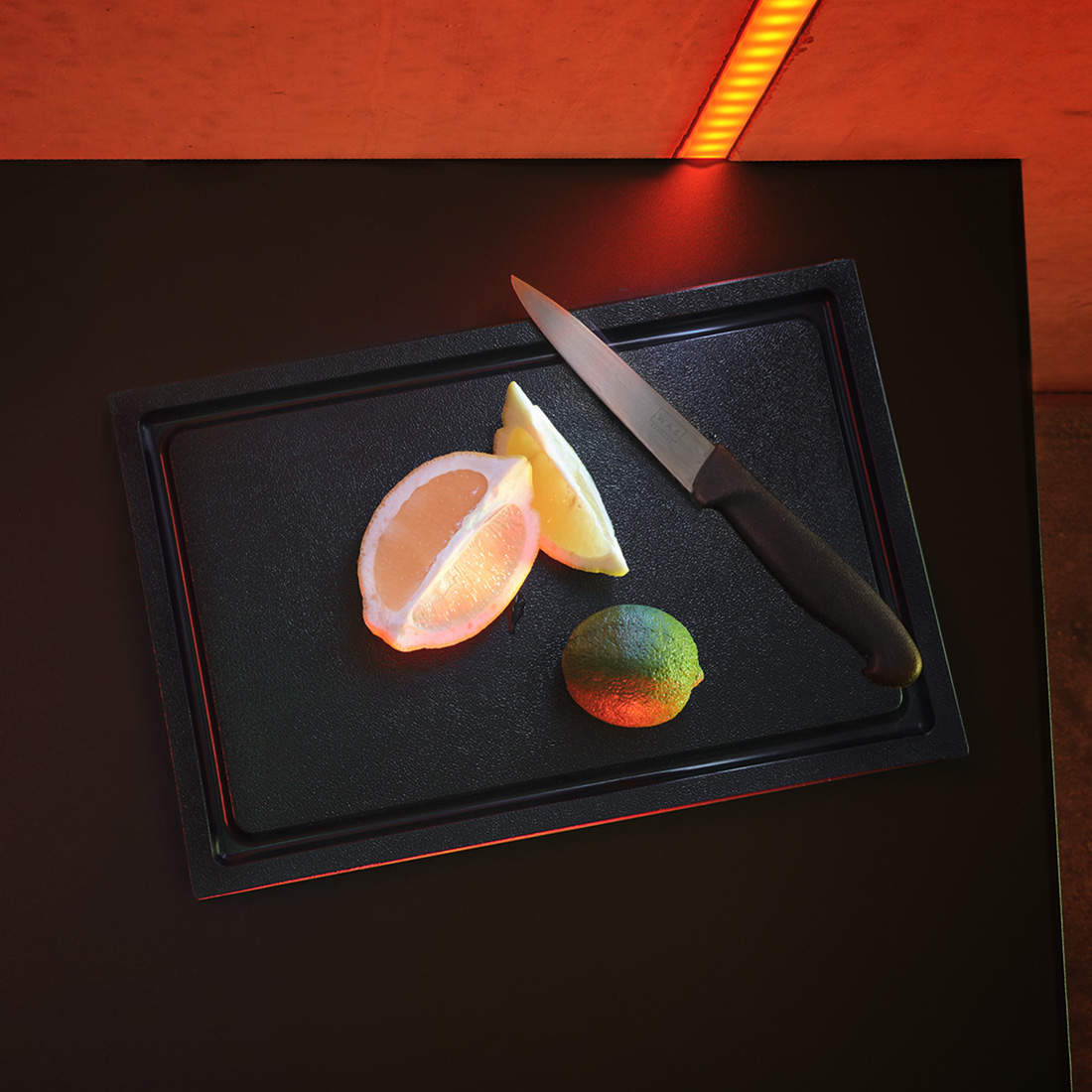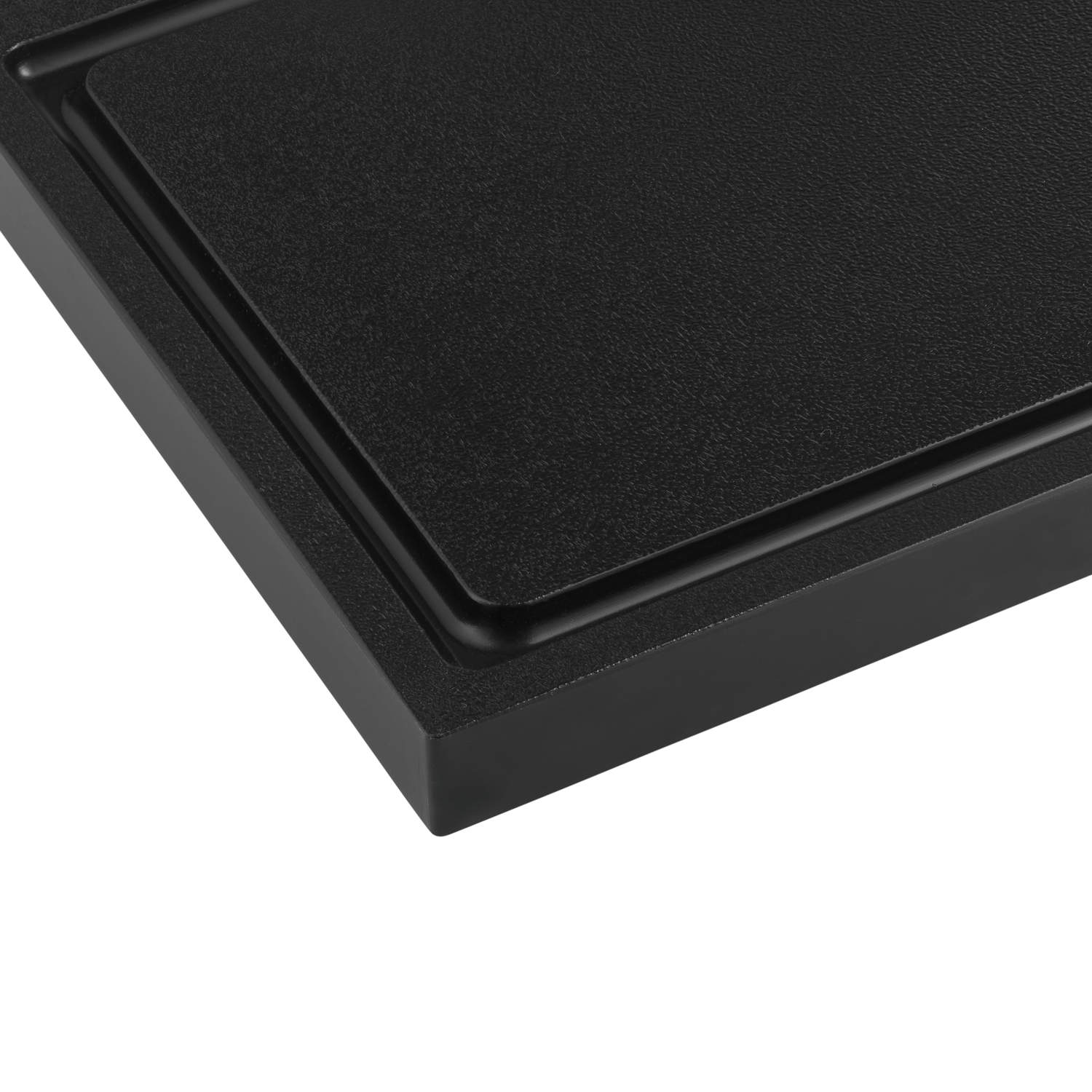 Schwarzes Schneidbrett mit Saftrinne aus Kunststoff. Ideal zum Schneiden von Zitrusfrüchten und anderen Zutaten in Ihrer Cocktailbar. Das Schneidbrett hat eine Größe von 30 x 20 cm und eine Dicke von 2 cm.