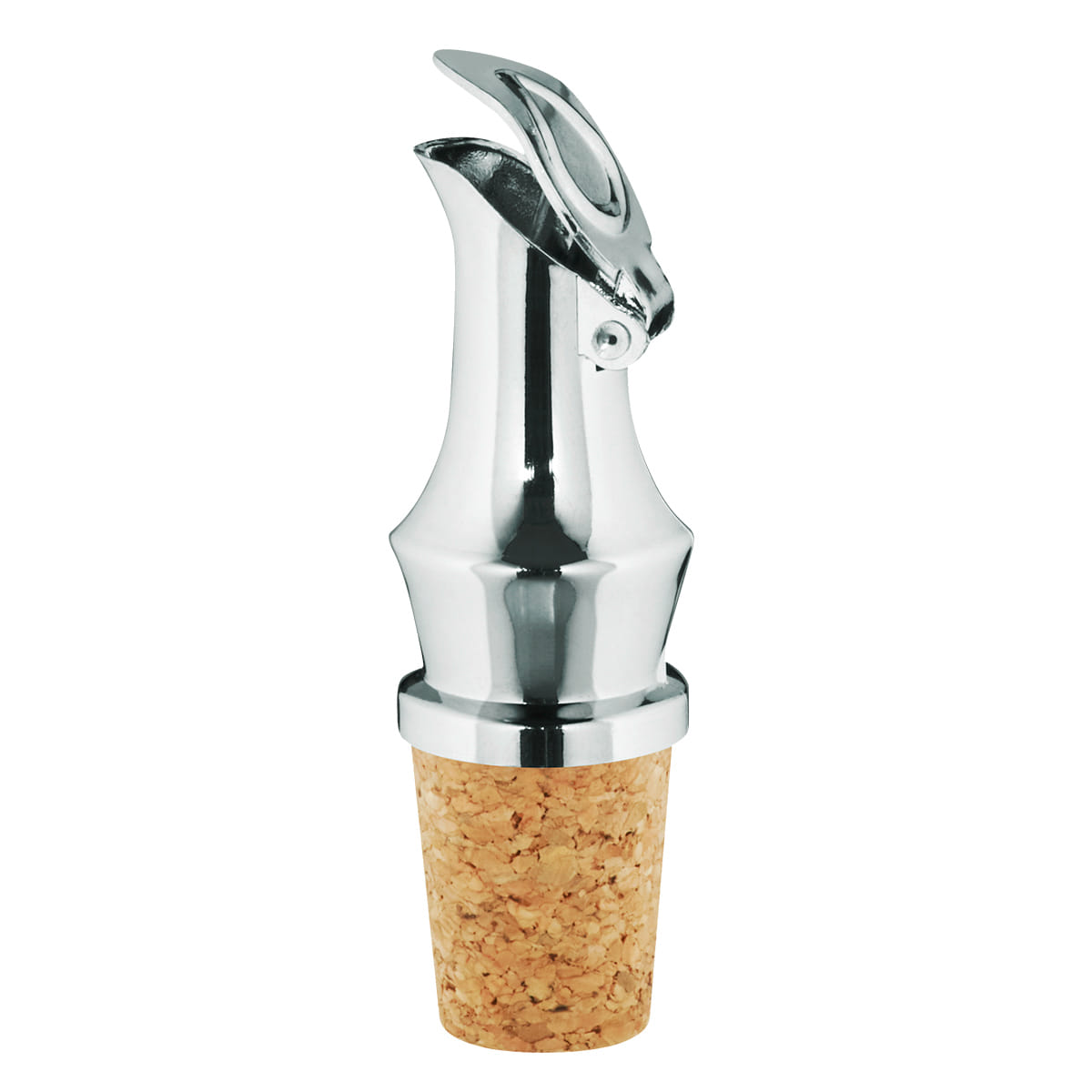 Verchromter Ausgießer mit Naturkorken. Elegante Form gibt viel Platz für dickflüssige Spirituosen. Auf dem Ausgießer ist ein Deckel mit einem Scharnier angebracht. Der Deckel öffnet und schließt sich automatisch. So können Sie ihre Spirituosen vor Insekten und Umwelteinflüssen schützen.Der konische Naturkorken ist für handelsübliche 0,7-1,0 Liter Flaschen ausgelegt. Eigenschaften des Ausgießers:mit automatischer Verschlusskappe